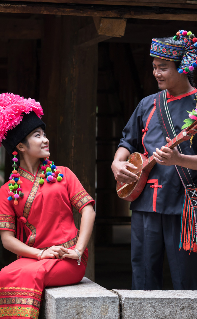 云南壯族主要聚居在文山州,人口114萬(wàn),民間的村寨大多依山傍水。壯族擅長(zhǎng)種植水稻,有太陽(yáng)崇拜和長(zhǎng)老崇拜的風(fēng)俗,視銅鼓為重器,厚愛銀飾,善烹制五色花米飯,能歌善舞,熱情好客。進(jìn)入景區(qū)壯族村,迎面有祭祀龍王的龍柱,兩邊是先民繪制的天王崖畫和為紀(jì)念傳說洪水泛濫時(shí)幫助先民度過劫難而建的石葫蘆亭。祭祀玉皇大帝的昊天閣和傳說能驅(qū)邪納福的碩大銅鼓聳立在廣場(chǎng)兩側(cè)。桿欄式和麻欄式民居、壯族青年社交休憩的“情廊”、村...